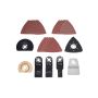 The kit includes a stainless steel scraper, 3 HCS saw blades, semi-circular saw blade, a 65 mm semi-circle grout saw, a sanding disc and 20 sanding sheets in grits of 60, 80, 120, and 180.