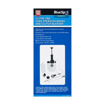 The Blue Spot Tools 3 Litre One User Operated Brake and Clutch Bleeder is ideal for bleeding brakes with no external power source. The brake and clutch bleeder is suitable for use with most vehicle types and the pressure range makes it ideal for use with ABS systems. The bleeder tank has a 3 litre capacity for holding hydraulic fluid. This enables the entire system to be flushed with one fill without the risk of running the reservoir dry. The brake bleeder is complete with a pressure gauge to easily check the operating pressure.Ideal for brake and clutch bleeding with no external power sourceSuitable for most vehicle types and for use with ABS systemsOne handed use3 litre capacity bleeder tank1 litre capacity suction bottleØ45mm cap with straight adaptorDO NOT EXCEED – 28PSI / 1.9 bar