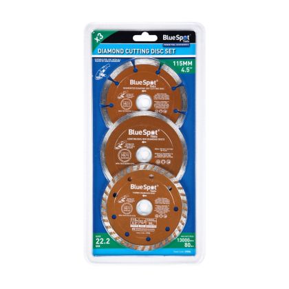 The Blue Spot Tools 3 PCE 115mm (4.5″) Diamond Cutting Disc Set features a range of discs for general use. 3 discs as follows: Segmented for general building use, turbo for general building use including both dry and wet cutting and a continuous rim disc for both wet and dry cutting of materials such as granite, ceramics and porcelain. Designed to provide fast and accurate cuts. Ideal for use with many materials including roof tiles, high-density concrete, kerbstones, slabs, pipes and bricks. High resistance to breakage and long-lasting durability. Suitable for all makes of angle grinders.Specially designed to provide fast and accurate dry cutting with a high resistance to breakage and long lasting durabilityIdeal for many materials including roof tiles, high density concrete, kerb stones, slabs, pipes and bricksSuitable for all makes of angle grindersDiameter: 115mm (4.5″) / Bore 22.2mm / Segment depth: 2-3cmMaximum safe speed: 13300rpm (80m/s)MPA Tested/EN13236