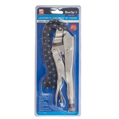 The Blue Spot Tools Locking Pliers With 18″ Chain are ideal for pipes, nuts and bolts with a large diameter. Manufactured from nickel-plated steel for increased durability. Features a heat-treated chain, adjustable jaw opening and quick release. Manufactured from nickel plated steel for increased durabilityIdeal for pipes, fittings, nuts and bolts with a large diameterHeat treated chainAdjustable jaw openingQuick releaseLength: 450mm / 18″
